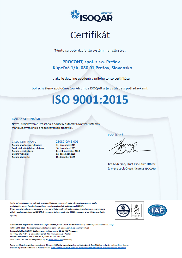 Naša spoločnosť pôsobí na trhu už viac ako tridsať rokov. Počas svojho pôsobenia zrealizovala desiatky úspešných projektov v oblasti automatizácie na Slovensku a v zahraničí. Od svojho vzniku je spoločnosť orientovaná na projektovanie, montáž a kompletné dodávky riadiacich a regulačných systémov pre automatizáciu výrobných liniek, manipulačnej techniky a vybraných technologických procesov. Montáž a oživovanie liniek realizujeme v našej montážnej hale vlastnými pracovníkmi. V spoločnosti je zavedený certifikovaný systém manažérstva kvality podľa ISO 9001, čo potvrdzuje kvalitu vykonanej práce vo všetkých jej oblastiach a zároveň dáva záruku neustáleho zlepšovania procesov a produktov pre zákazníkov spoločnosti Procont.